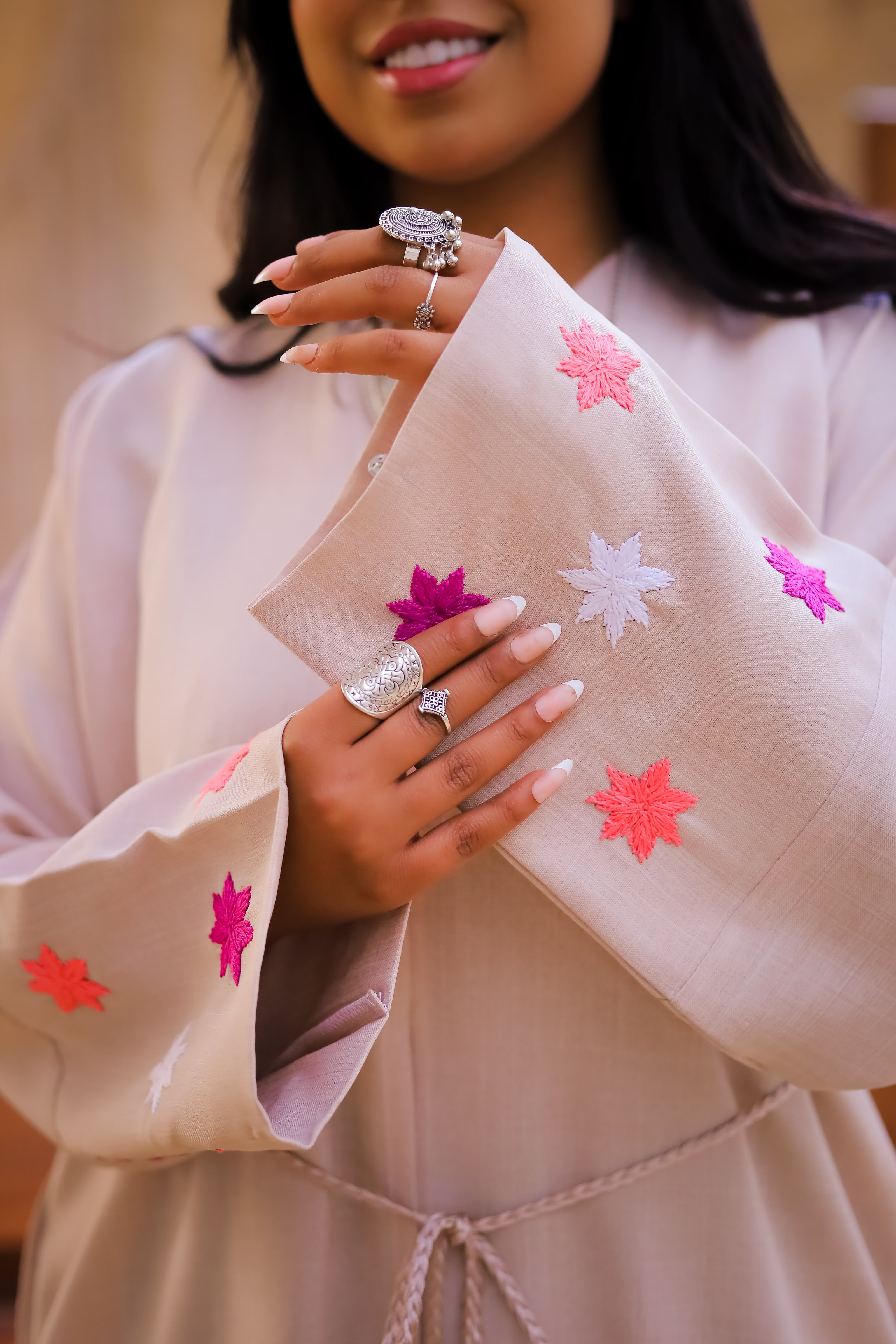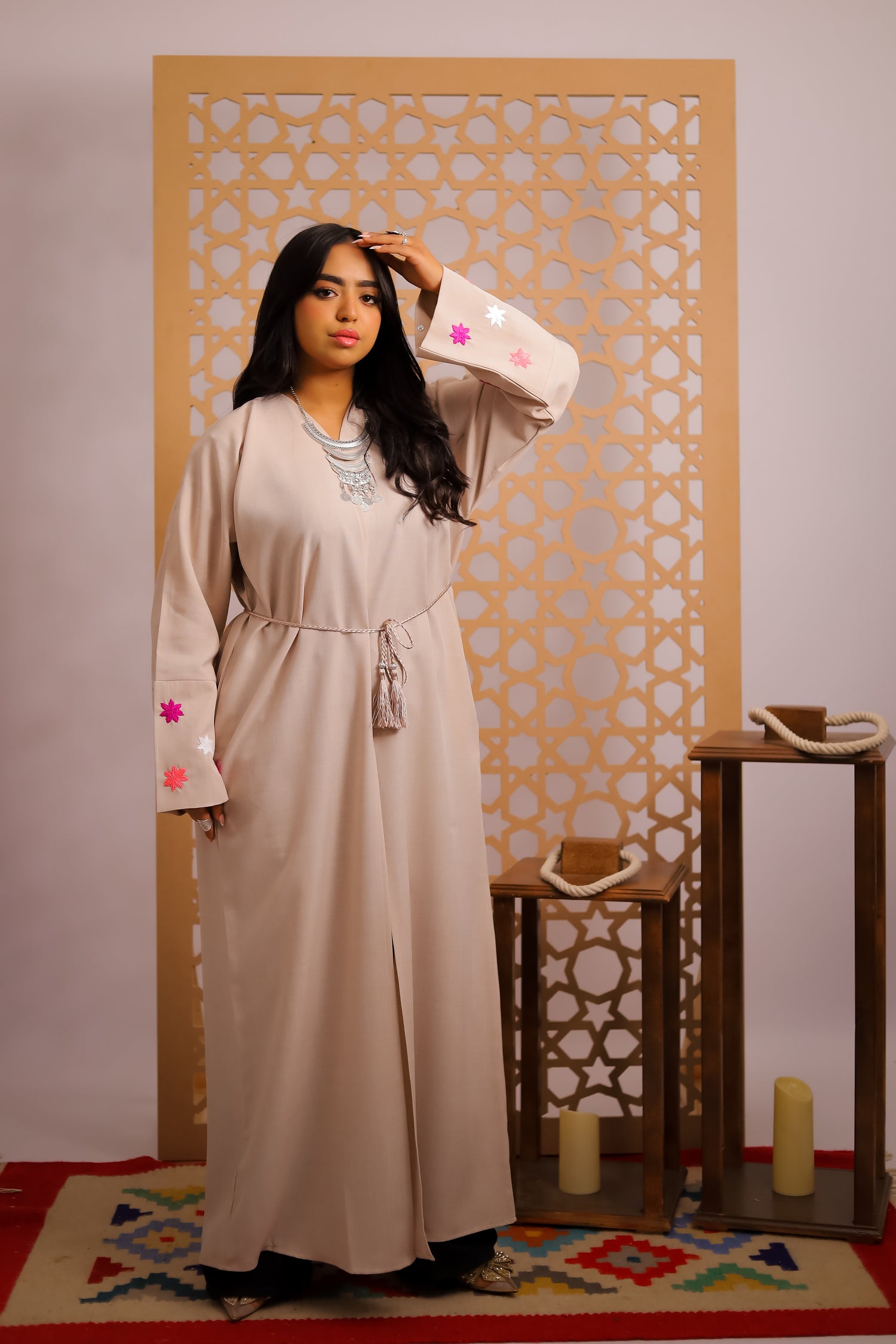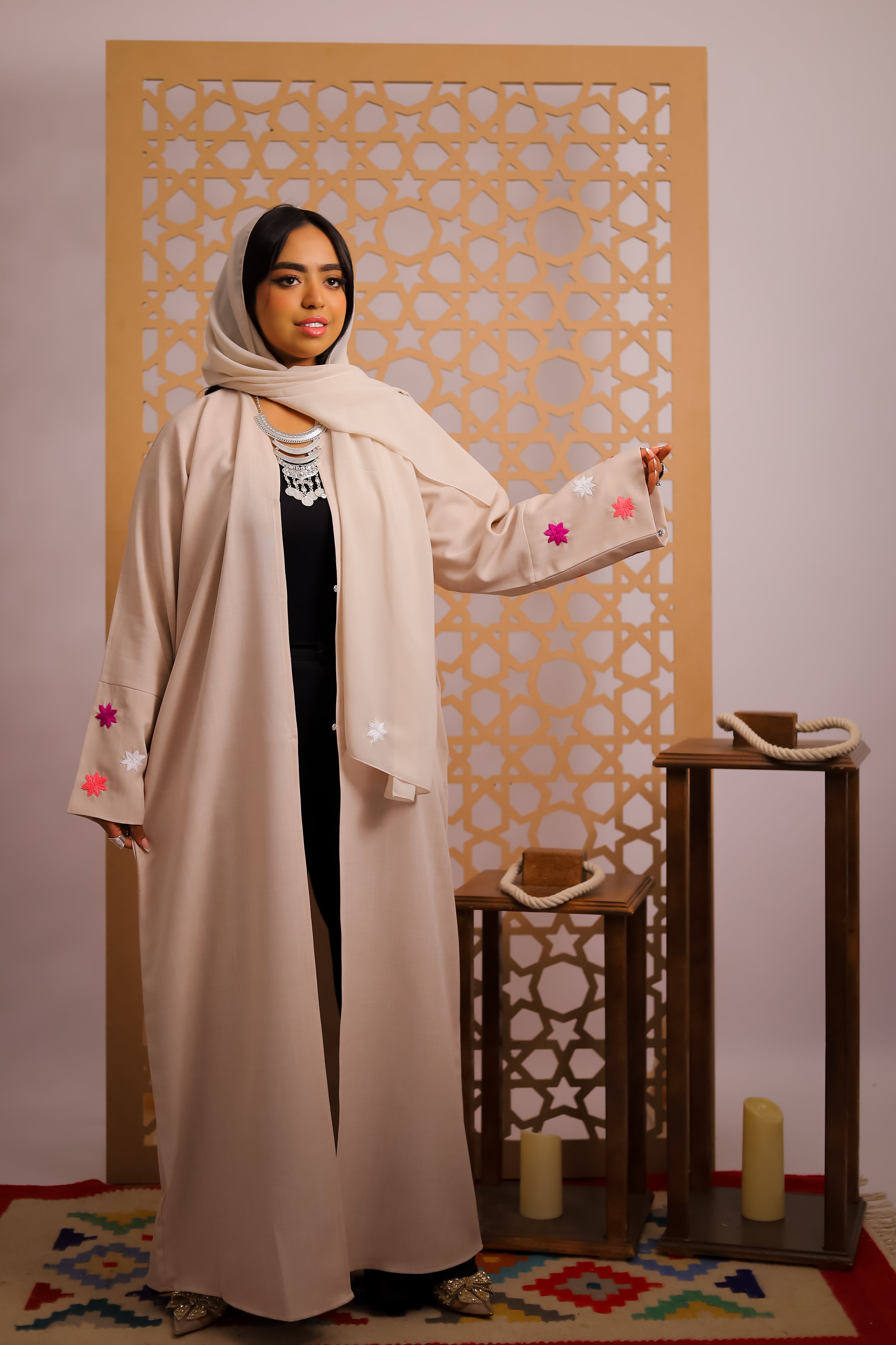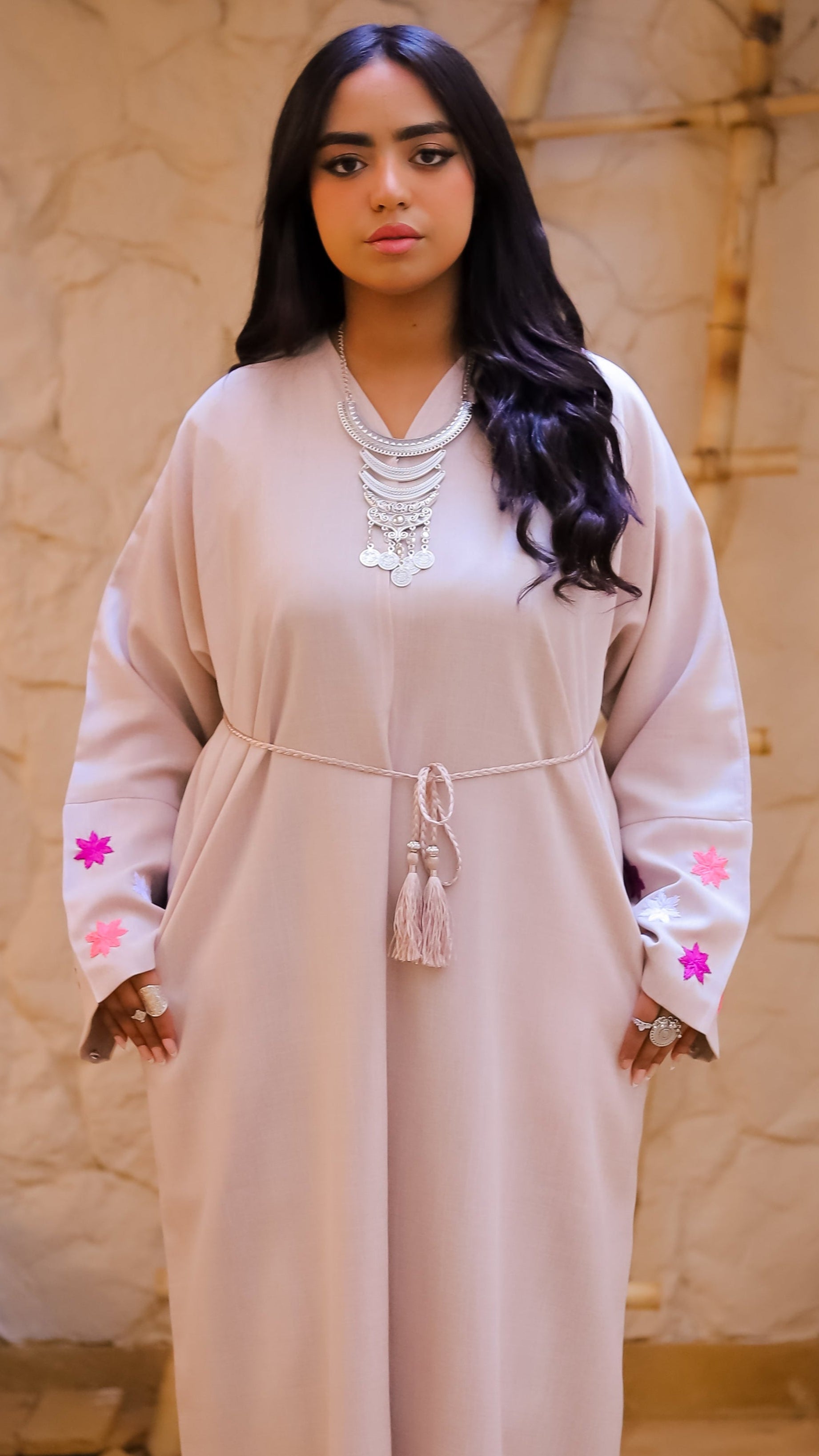 "Our abaya is a perfect blend of elegance and versatility. Designed with intricate embroidery on the sleeves, it features a removable belt for a customizable fit and comes complete with a matching headscarf. Crafted with comfort and style in mind, this timeless piece is perfect for any occasion."